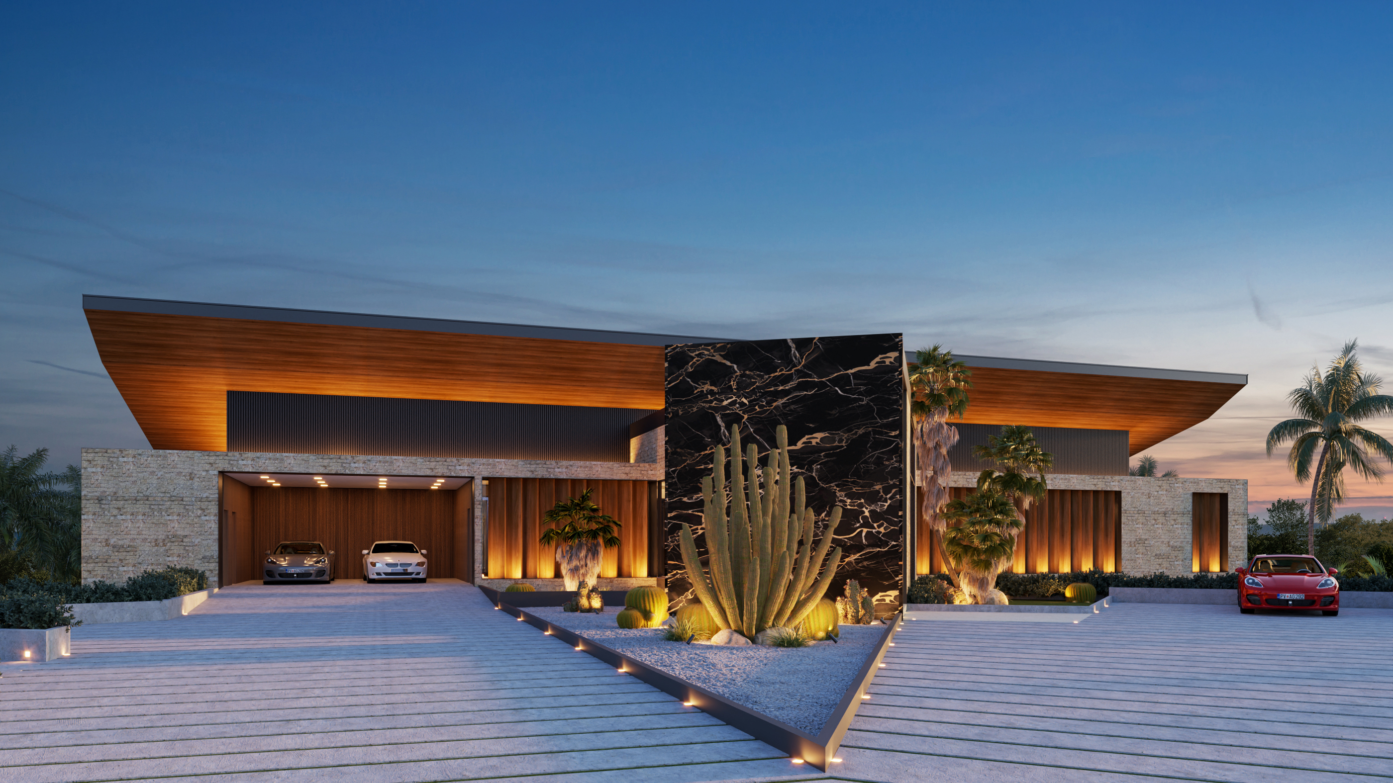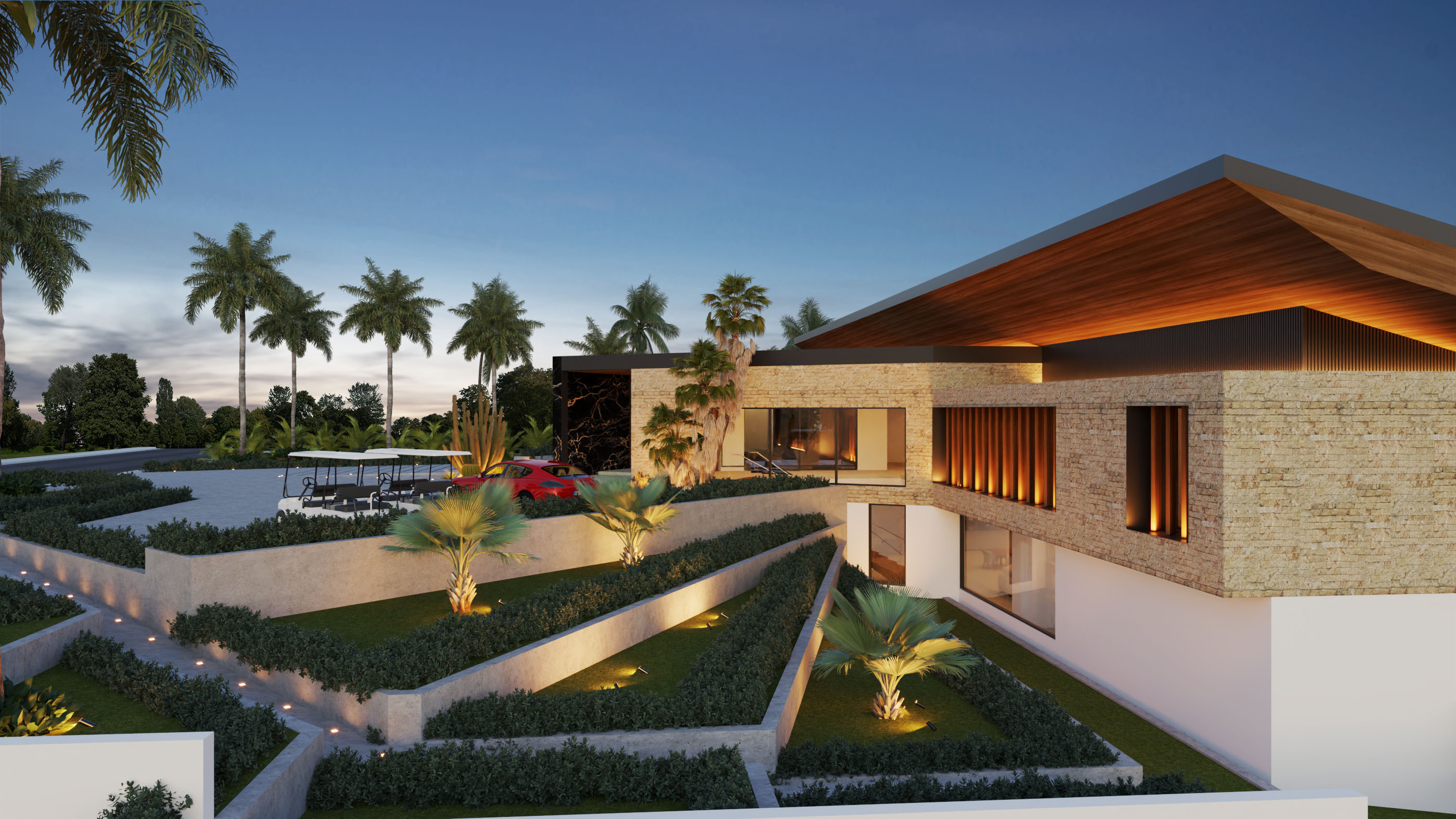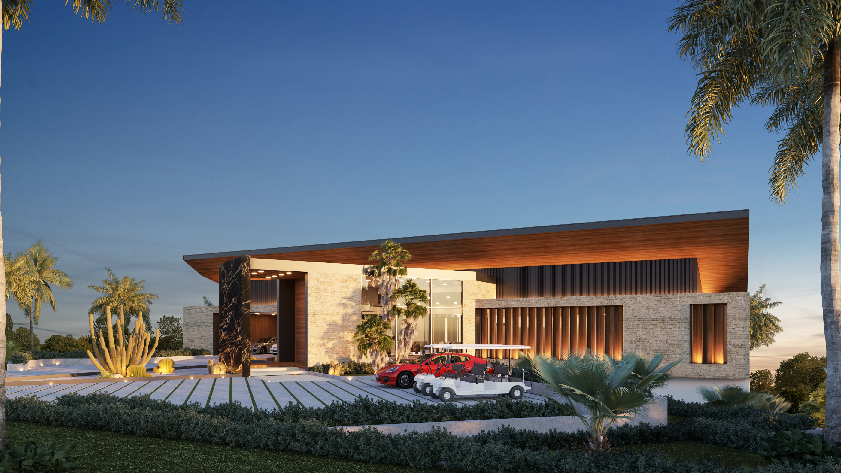 Ubicada dentro de Casa de Campo, Catalina 05 se organiza a partir de la topografía del terreno, el cual desciende aproximadamente 10 metros y define la lógica espacial del proyecto. El acceso se produce en el segundo nivel, desde donde un lobby central articula la circulación hacia las áreas inferiores, permitiendo que la vivienda se despliegue en sección para maximizar las visuales hacia Isla Catalina.