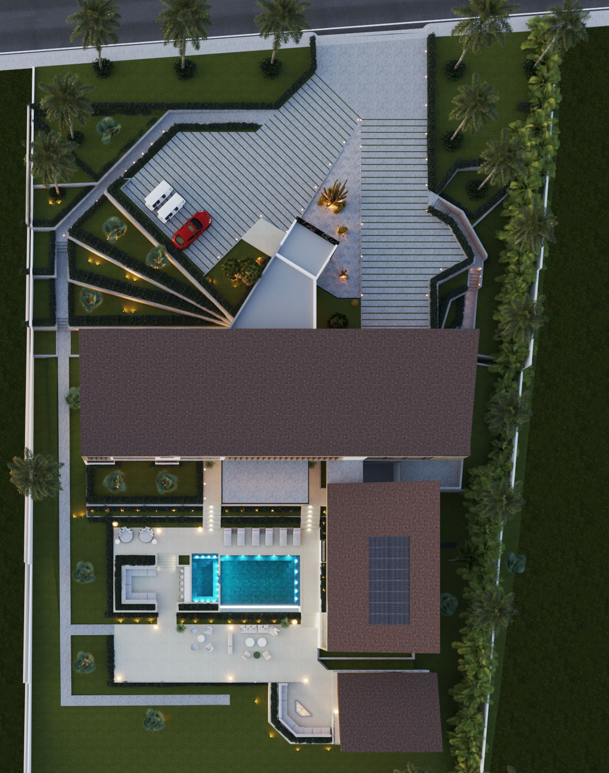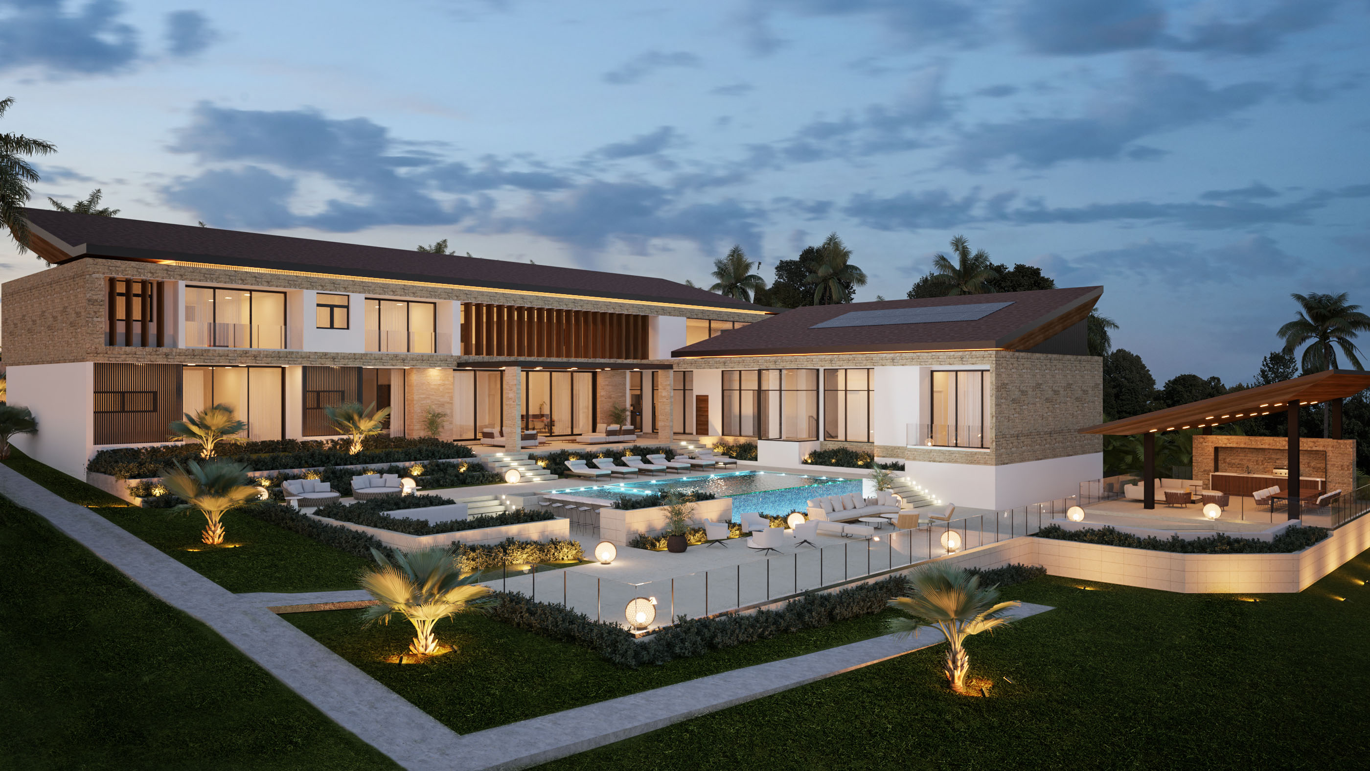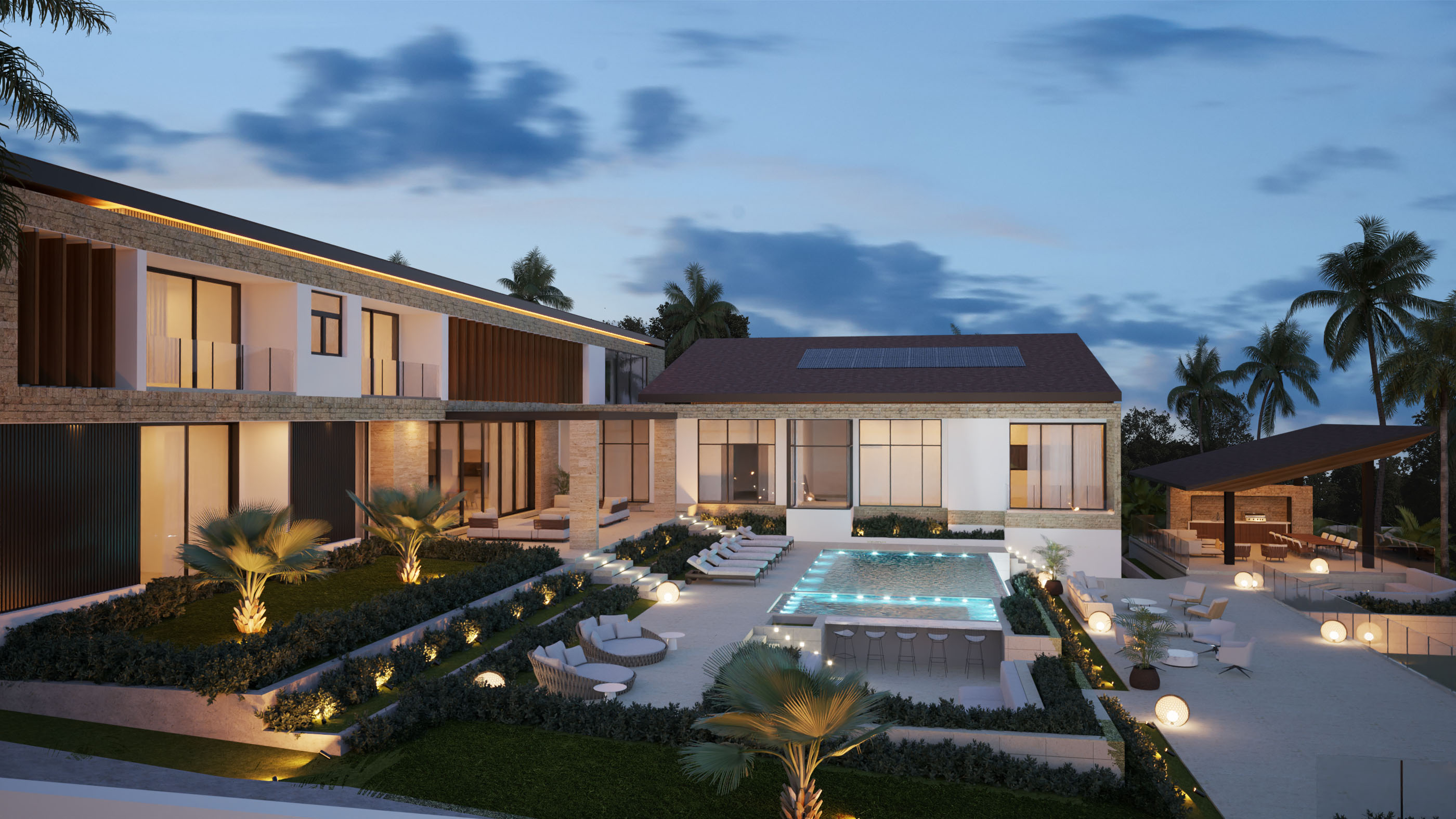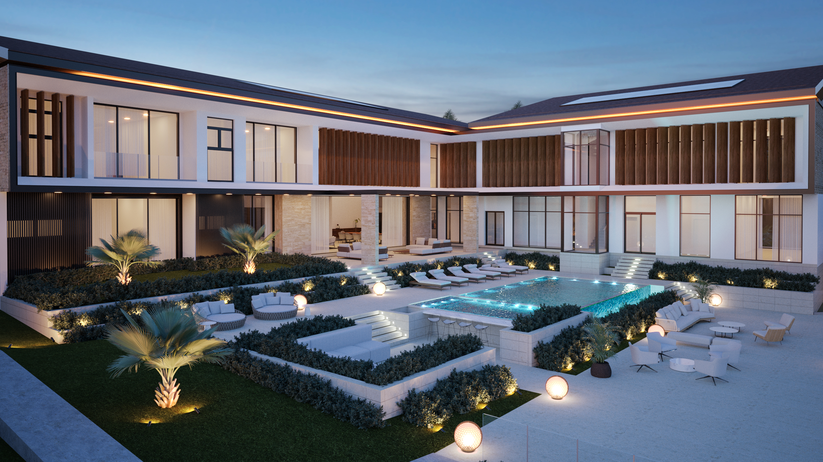 Ubicada dentro de Casa de Campo, Catalina 05 se organiza a partir de la topografía del terreno, el cual desciende aproximadamente 10 metros y define la lógica espacial del proyecto. El acceso se produce en el segundo nivel, desde donde un lobby central articula la circulación hacia las áreas inferiores, permitiendo que la vivienda se despliegue en sección para maximizar las visuales hacia Isla Catalina.